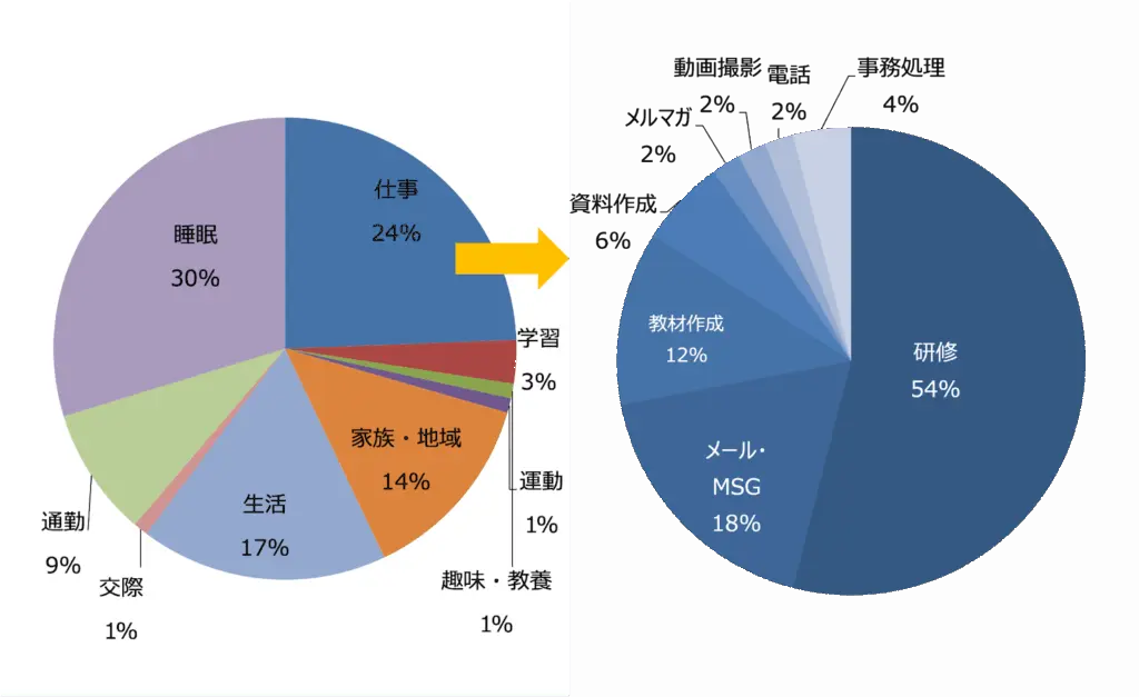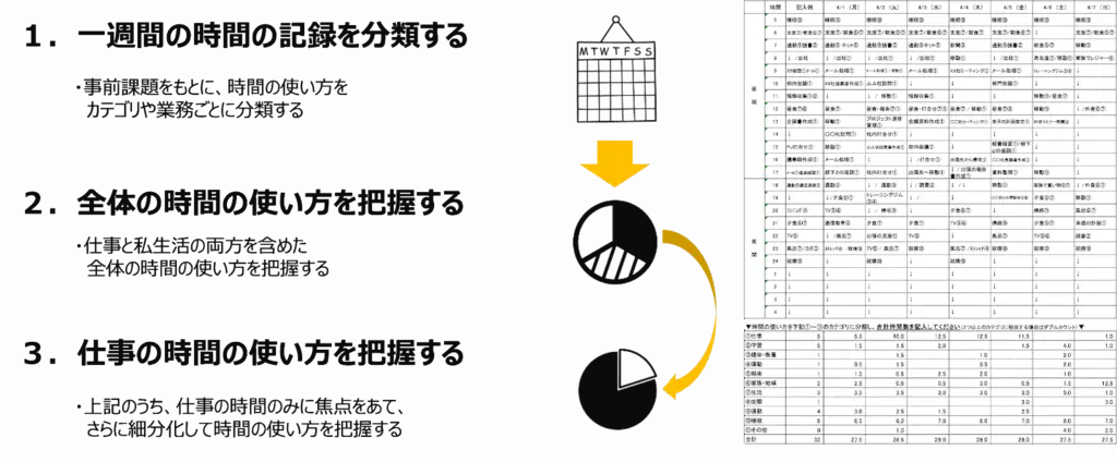 企業で行われるタイムマネジメント研修では、しばしば「仕事の時間」だけを記録や分析の対象にすることが多いです。しかし、ワークライフバランスを整えるためには、私生活の時間も含めて、24時間すべてを分析の対象とすることが必要です。どれだけ仕事の内訳が優れていたとしても、労働時間の総量が多かったらワークライフバランスを保つのは困難だからです。