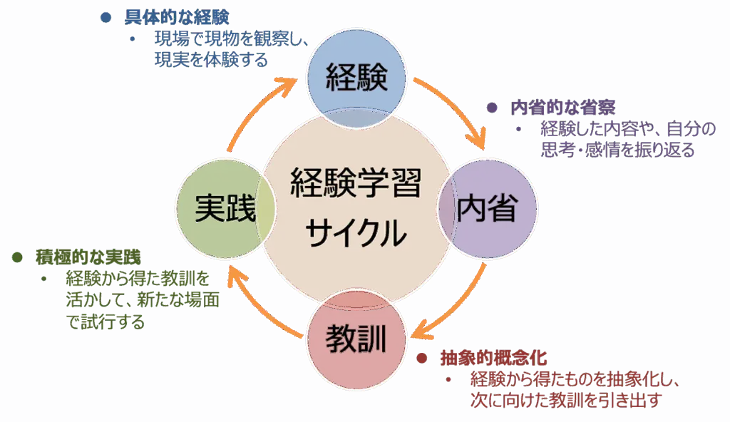 この方法は、デービッド・コルブの「経験学習サイクル」に相当するものです。経験を内省して状況や思考、感情を振り返り、そこから教訓(抽象概念)を取り出し、次の実践で検証するという循環です。言語化は「抽象化の核」であり、再現可能な手順として共有できる形式に変換する作業でもあります。