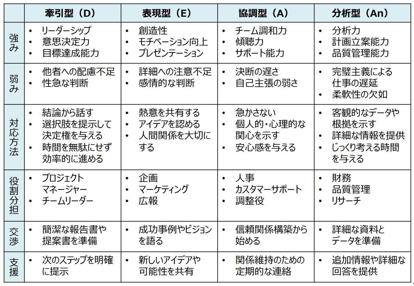 例えば、牽引型はリーダーシップや意思決定力、目標達成力が強みである一方、相手への配慮が不足しがちであったり、スピードを重視するあまり性急な判断をしてしまうこともあります。