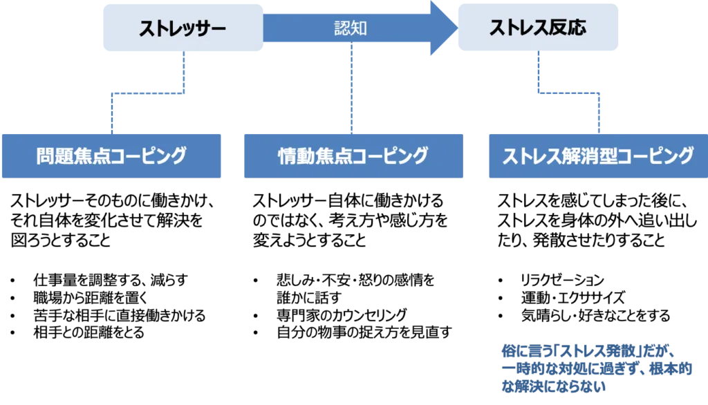 ストレスの対処法を「ストレスコーピング」と呼びます。このコーピングには大きく分けて3つの種類があります。